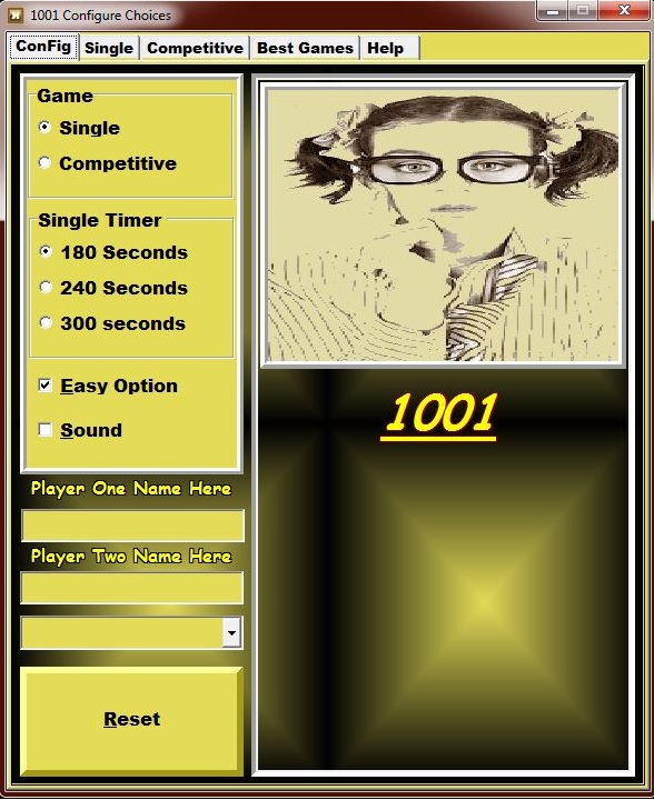1001 is a fun game that can improve your arithmetic skills and help train your memory. Using the ConFig page, the player enters a nickname, selects a game mode and finally the time. 'Easy Option' allows you to view hidden numbers. If you do not select this option, you must remember the location of the numbers. At the beginning, random numbers from 1 to 100 are placed in 16 boxes. The main objective is to add and subtract numbers to reach 1001 then the game ends.