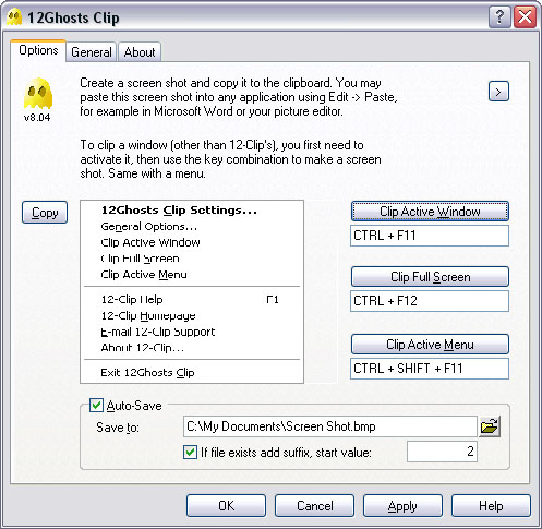 12Ghost Clip is a program that makes it easy to create screenshots. It supports hot-key shortcuts that you define yourself. You can capture the whole screen or just parts of the screen.