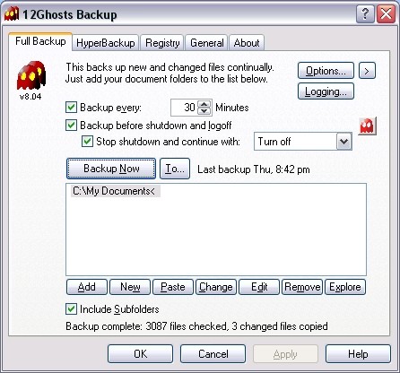 12Ghosts Backup is a handy tool for advanced automatic backup of your important data. Backups can be made to local and network drives, USB external drives, as well as CD and DVD media (with the necessary drivers). You can set up very detailed backup directories, individual backup intervals, or trigger tasks when shutting down/logging off your computer.