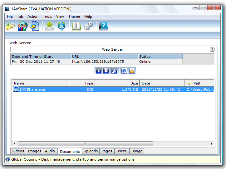 1AVShare is secure software designed for hosting your own web server and sharing documents with your friends or colleagues. You can share things like videos, documents, images or any other type of file through it. There is also an integrated SMTP client that allows you to configure an email account in order to share files via email.