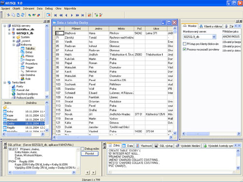 602SQL is a powerful and reliable database system for running, storing, presenting and distributing data and for rapid development of database applications. It is compliant with the ANSI/ISO SQL standard at the SQL 2 Intermediate level, allows writing procedures and triggers according to the SQL 3 standard, and supports BLOB/CLOB and full-text index. XML support is also implemented.