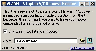 A.L.A.R.M. free open source (GPL) utility for Win XP and newer, working in the system tray. If someone disconnects your laptop from the network, a loud alarm is triggered. The alarm will only go off when the power is turned back on.
