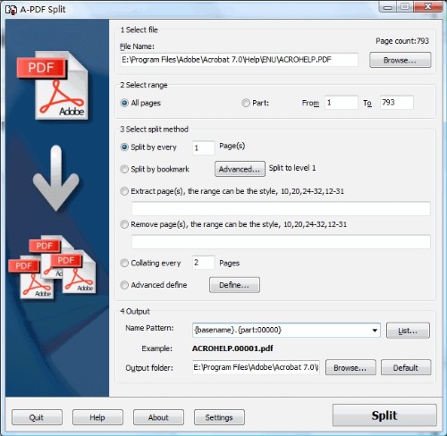 A-PDF Split is a quality tool that allows you to split any Acrobat PDF file into smaller ones.