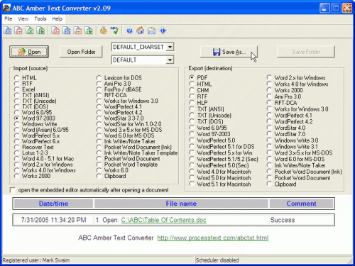 ABC Amber Text Converter is a powerful software for converting text documents to various formats such as: PDF, HTML, CHM, RTF, HLP, TXT, DOC, XLS, MCW, WRI, WPD, WK4, WPS, SAM, RFT, WSD, PWI, PSW, PWD and many more.