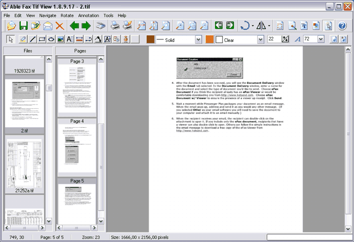 Able Fax Tif View allows editing of loaded images: extracting, moving, inserting, deleting, rotating, inserting text and other functions.
