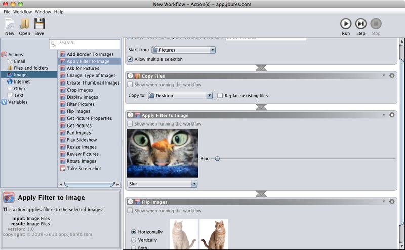 Action(s) allows you to create workflows that achieve manual chores quickly, efficiently and effortlessly. You don't need to know any scripting languages or write any code. Instead, you create and implement an automation "workflow" by simply dragging and dropping each step of the process. It's like creating a kitchen recipe. Action(s) comes with dozens of predefined actions you can use to populate your workflow. For example, let's say you want to resize dozens of images and send them to your friends via emails. By dragging each action into a new workflow, you tell the action(s) which files to send and where. Then run the workflow. Within minutes, all the images are in your friends' inboxes. There is no limit to what you can do.