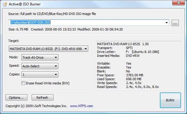 Active@ ISO Burner is a free application that allows you to burn CD/DVD/Blu-Ray ISO image files compatible with the ISO 9660 standard. Automatic burning is also supported. This application burns ISO files to CD-R, DVD-R, DVD+R, CD-RW, DVD-RW, DL DVD+RW, HD DVD and Blu-ray Disc.