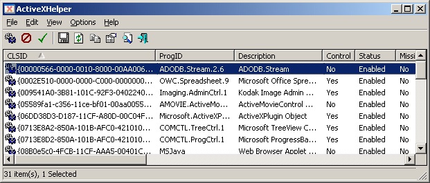 ActiveXHelper is a small tool that allows you to view basic information about ActiveX components installed on your computer. You can view the entire (and very large) list of ActiveX components by loading them from the HKEY_CLASSES_ROOT CLSID key registry or alternatively by specified criteria. In addition, you can temporarily disable certain ActiveX components. If ActiveX components are disabled, they cannot be used in any program until you re-enable them.
