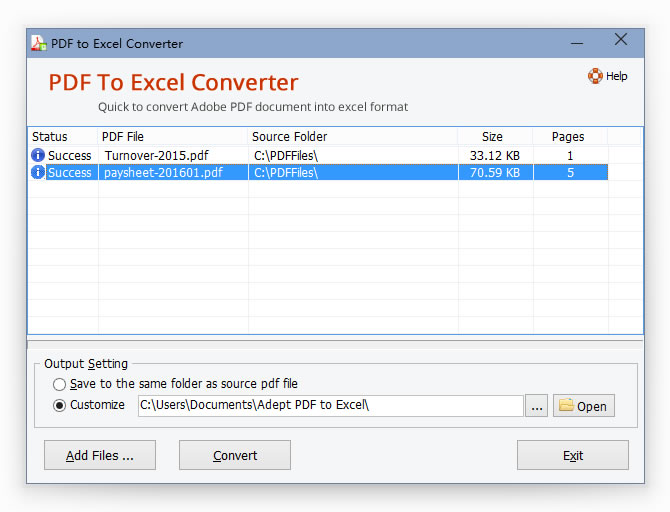 Adept PDF to Excel Converter is a handy conversion tool to help you convert PDF files to Microsoft Excel format. It preserves all data as well as layout and formatting of PDF files after conversion. You can easily perform calculations, re-arrange sheets and change data in Excel output tables. Adept PDF to Excel Converter software is a standalone program and does not require Microsoft Excel, Adobe Acrobat, or even Acrobat Reader.