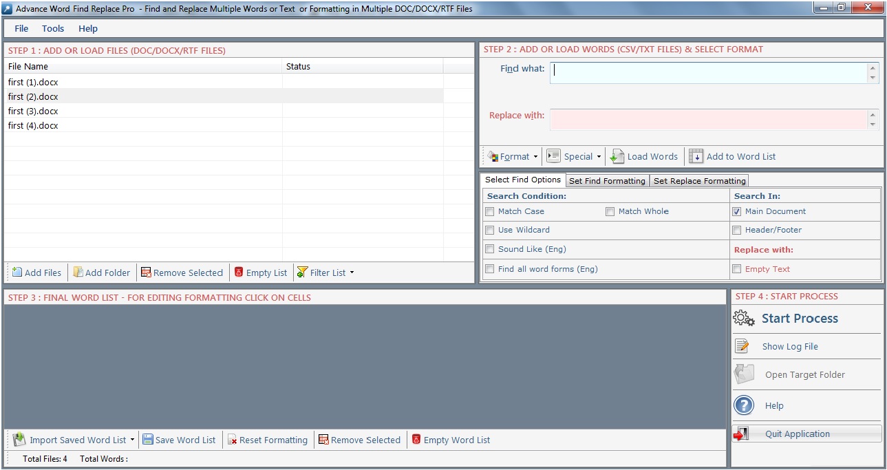Advance Word Find & Replace Pro is an ideal helper that can not only find and replace but also highlight each word with different criteria and formatting. New features such as Unicode support and color selection are available. Supported files (MS Word 2000, 2003, 2007, 2010 doc/docx/RTF files).