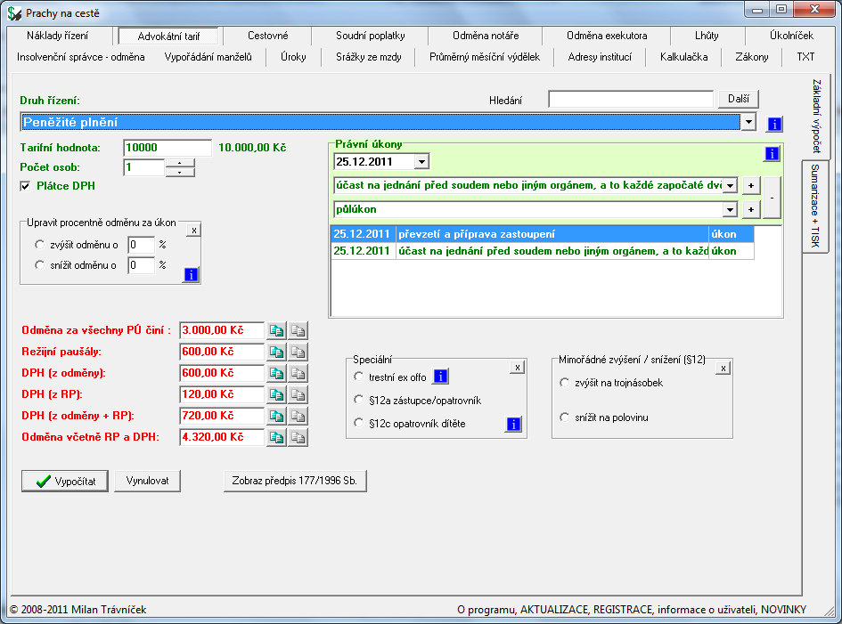 Attorney's fee calculator enables the calculation of attorney's fees according to Decree No. 177/1996 Coll., court fees, travel expenses, interest and default fee, database of court addresses, etc.