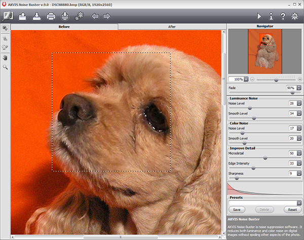 AKVIS Noise Buster is a program designed to suppress noise in digital photographs. The program focuses on correcting luminance and color noise with separate control settings for each of these categories. One feature in the app that is particularly nice is the histogram that detects and shows, at a single glance, both luminance and color noise levels in the digital photo you are editing.