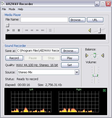 All2WAV Recorder is a handy tool for recording and playing back audio. It allows you to record from a microphone, internet streaming radio, games or various multimedia files. The recorded audio is saved in WAV format. Possibility to adjust the sound quality of the WAV file (from 8000 Hz 8-bit Mono to 48000 Hz 16-bit Stereo).