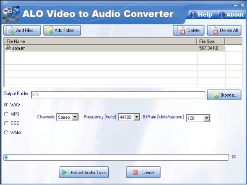 ALO Video to Audio Converter is a simple tool designed to extract audio from AVI, WMV, ASF, RM, RAM, RMVB, MOV, QT, DAT, MPG and MPEG video files. The output audio format is MP3, WAV, WMA and OGG file. It offers batch conversion, high conversion speed and drag and drop operation.