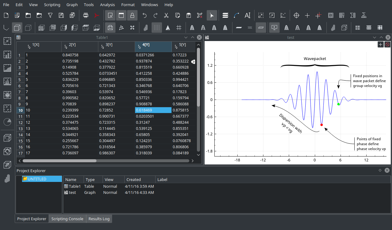 AlphaPlot is a program for interactive generation of scientific graphs and data analysis. It allows you to create. It can generate various types of 2D and 3D graphs that are plotted against external source data or manually entered numbers into a spreadsheet editor. Data is inserted into the tables by columns, (for example X and Y). The generated statistical charts can be exported as a PDF, SVG or ESP file. Direct printing is also available.