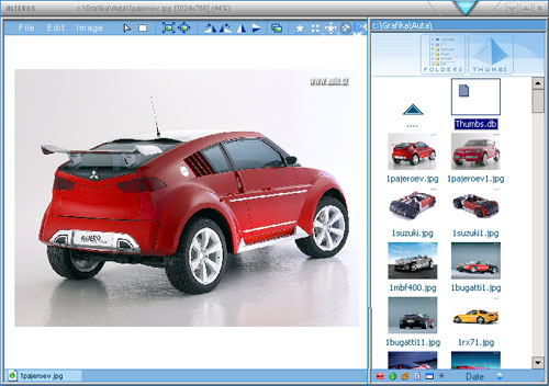 Alteros Viewer supports graphic formats such as: bmp, btn*, dib, emf, gif, ico, jif, jpe, jpeg, jpg, pcx, rle, tga, wmf, psd, tiff, png, ppm, cel, iff, rgb, fli/flc (first image preview), pic, tim. It is possible to edit text files with the program.