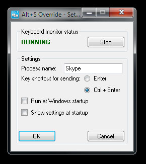 To make the program work properly, just set the name of the monitored process (e.g.: for Skype.exe it will be Skype, for ICQ.exe it will be ICQ) and which keyboard shortcut in the program works for sending (Enter or Ctrl+Enter). The program runs hidden in the system tray (bottom right corner of the screen) and "translates" the Alt+S keyboard shortcut to the set combination.