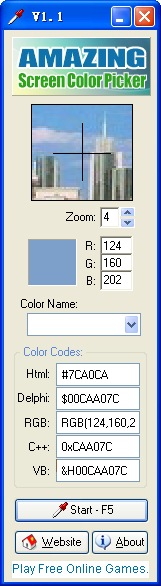 Amazing Screen Color Picker is a graphical tool for selecting and analyzing the color displayed on the screen. Using the integrated magnifying glass, you can easily and accurately select the color at the cursor location. The program starts at Windows startup or can be invoked with a hot key. In addition, it allows you to convert color values to RGB, HTML, Delphi, VC++, VB code that are used for web or software development.