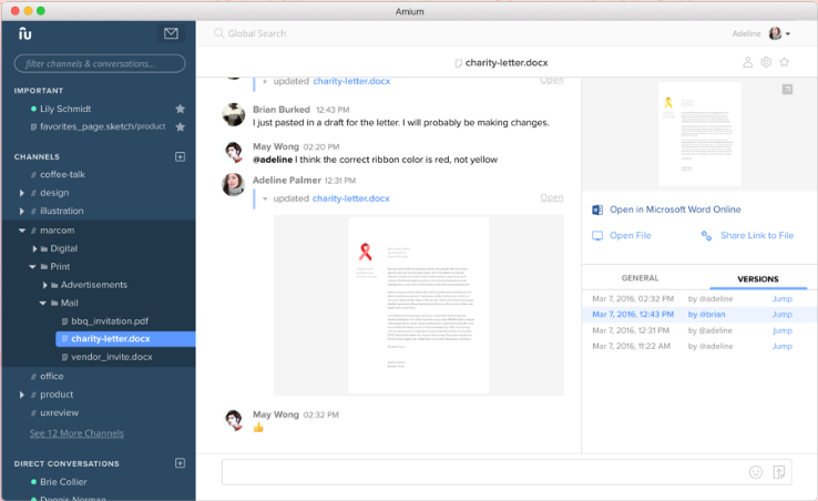 Amium is a document and file sharing and editing program for Microsoft Office, Excel and PowerPoint. All versions of documents are saved for later editing. Extension of functionality is possible through the integration of services and platforms such as BitBucket, GitHub, HelloSign, Jira, FreshDeck, Crashlytics, Mailchimp, New Relic, PageDuty, Stripe, Bonusly, Cat, Reaction or even Giphy. Files are constantly synced and shared so you can work on them together in real time. Changes appear right away in the conversation sequence.