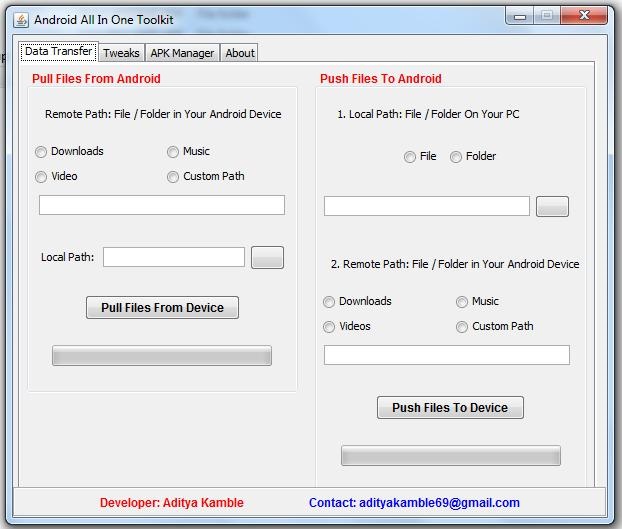Android All In One Toolkit is a workflow creation tool for easier things like transferring data from PC to phone and vice versa, rather than connecting mass storage via USB you can transfer data using this tool via ADB. No need for any command just use this tool for things like features: 1. Fast data transfer using ADB (instead of SD card) 2. Tweaks for Android 3. Build Prop Editor 4. Android Manager APK