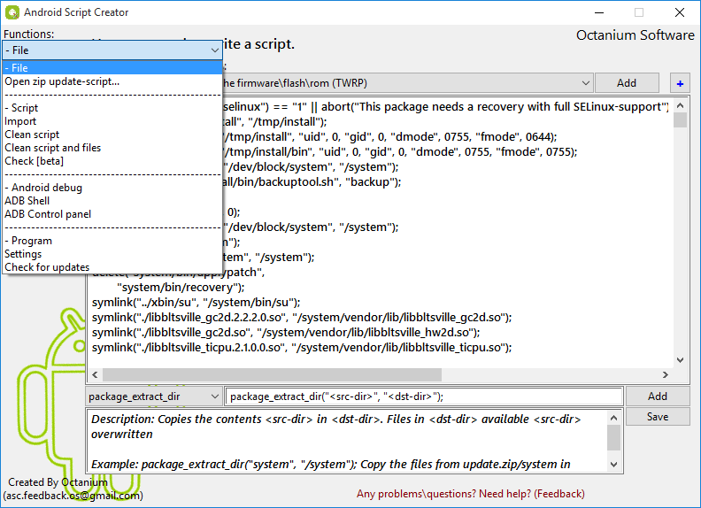 Android Script Creator is an application for creating and opening Android update scripts (update.zip). The app also allows you to add files to the script, use ADB (Android Debug Bridge) for debugging via command line, etc. The Java JDK needs to be installed to work properly.