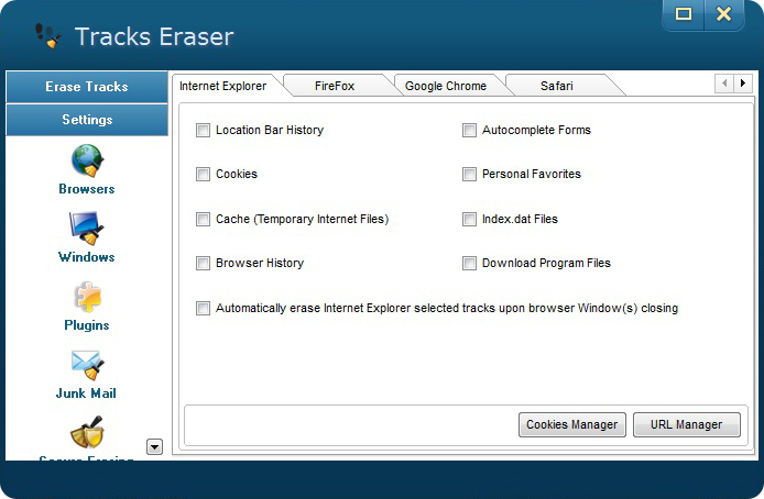 With Anti Tracks installed on your computer, you can permanently erase the browsing history of all web browsers, computer activities and program information history stored in hidden files on your computer. Anti Tracks supports Internet Explorer, AOL, Netscape/Mozilla and Opera browsers.