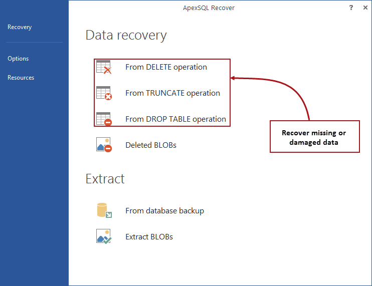 ApexSQL Recover is an application designed to recover data removed from SQL database due to DELETE, TRUNCATE or DROP TABLE queries. It can also extract data directly from backup files or restore deleted BLOBs, undo inadvertent database changes, recover data deleted from SharePoint or extract BLOBs stored as files.