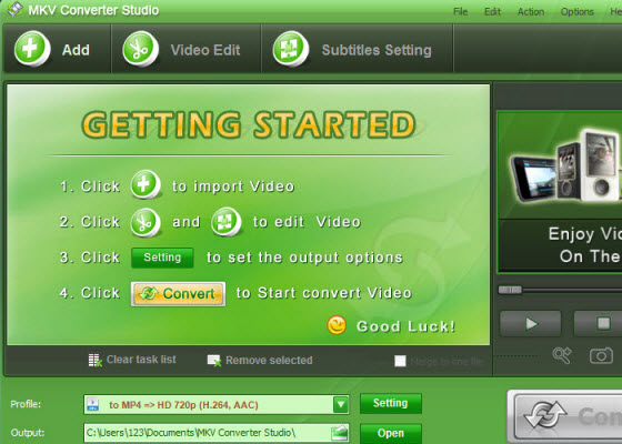 Apowersoft MKV Converter Studio is an excellent tool for converting MKV files. It supports converting MKV to almost all popular video formats and supports MKA files to audio formats such as MP3, WMA, AAC, OGG and M4A. Supports convert subtitles in MKV videos, or import subtitles for videos from external files such as .srt, .sub, .ssa, .ass, .smi, .psb, .tex and .idx. After converting MKV files, the files will be fully compatible with digital player such as Apple TV, Zune, Android phone, iPad, MP4 player, PSP, BlackBerry, iPhone, PS3 and many more.