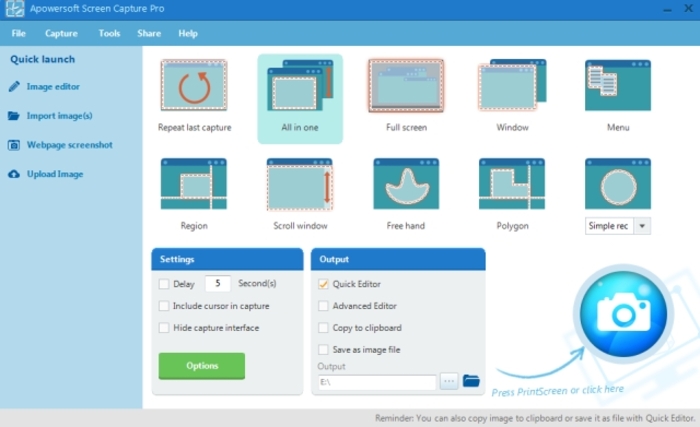 Apowersoft Screen Capture Pro is a tool that is used to capture screen activity or screenshots. Thanks to the user-friendly interface, you are able to quickly access the functions in this program. Whether it's a quick snapshot or easy screen recording, Apowersoft Screen Capture Pro allows you to take advantage of all of them. The edited images can be exported to PNG, JPEG, BMP, GIF or TIF format. Video is saved in WMV format, and you can also set the video codec, bitrate and frame rate.