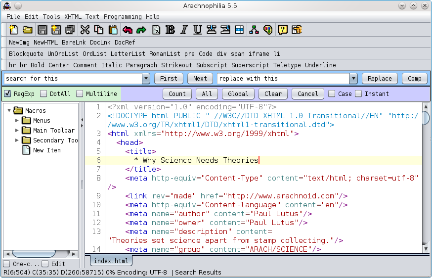 Arachnophilia is an easy-to-use HTML editing tool designed for programmers to create websites. It has many useful features: syntax highlighting, macro support, internal browser, easy table creation, etc. It also offers the ability to go back 100 steps in case of an error. It is built in Java.