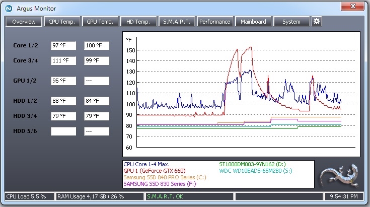 Argus Monitor is a user-friendly and sophisticated program that has been created for thorough diagnosis and monitoring of motherboard, HDD, CPU or GPU. Among other things, this program can also display the so-called S.M.A.R.T. information, with which you can get an overview of the health of your HDD. Last but not least, it can measure the overall system speed.