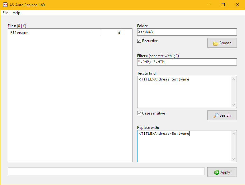 AS-Auto Replace is a program designed to make it easier to search and replace multiple text files at once. It displays the number of occurrences of the search term for each file.It is ideal for web and software developers! The program works very fast and is easy to use.
