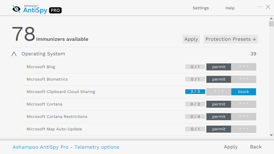Ashampoo AntiSpy Pro stops data collection by Google, Office, Bing, hardware manufacturers and more. By disabling the sending of telemetry data to over 100 locations on Windows 10, 8 and 7, your privacy is greatly enhanced.