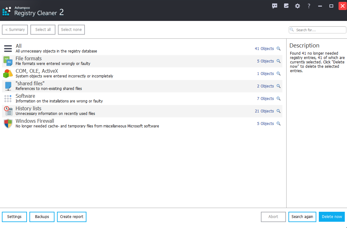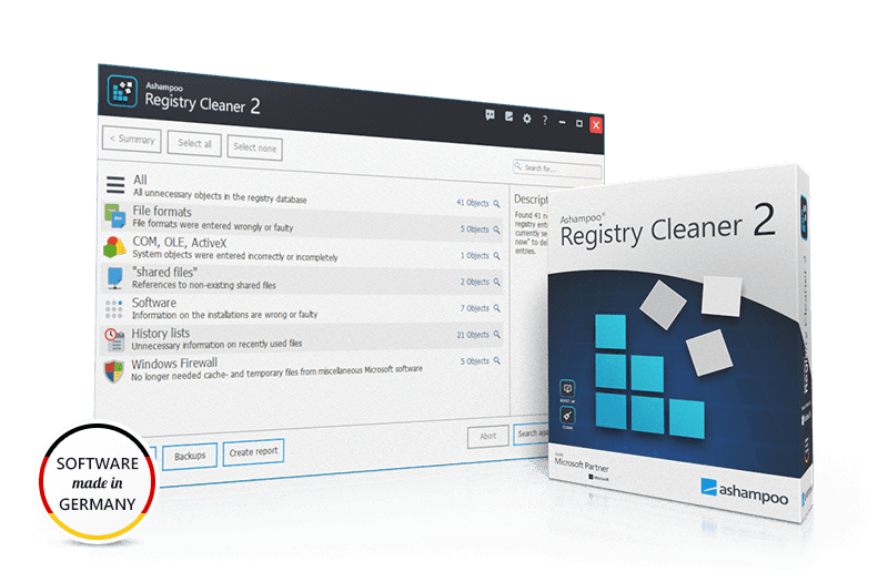 With Ashampoo Registry Cleaner you can easily and safely remove unnecessary or corrupt registry entries. Faulty registry links are also repaired. The real-time backup in Ashampoo Registry Cleaner offers maximum security and allows you to restore the Windows registry to its original state at any time.