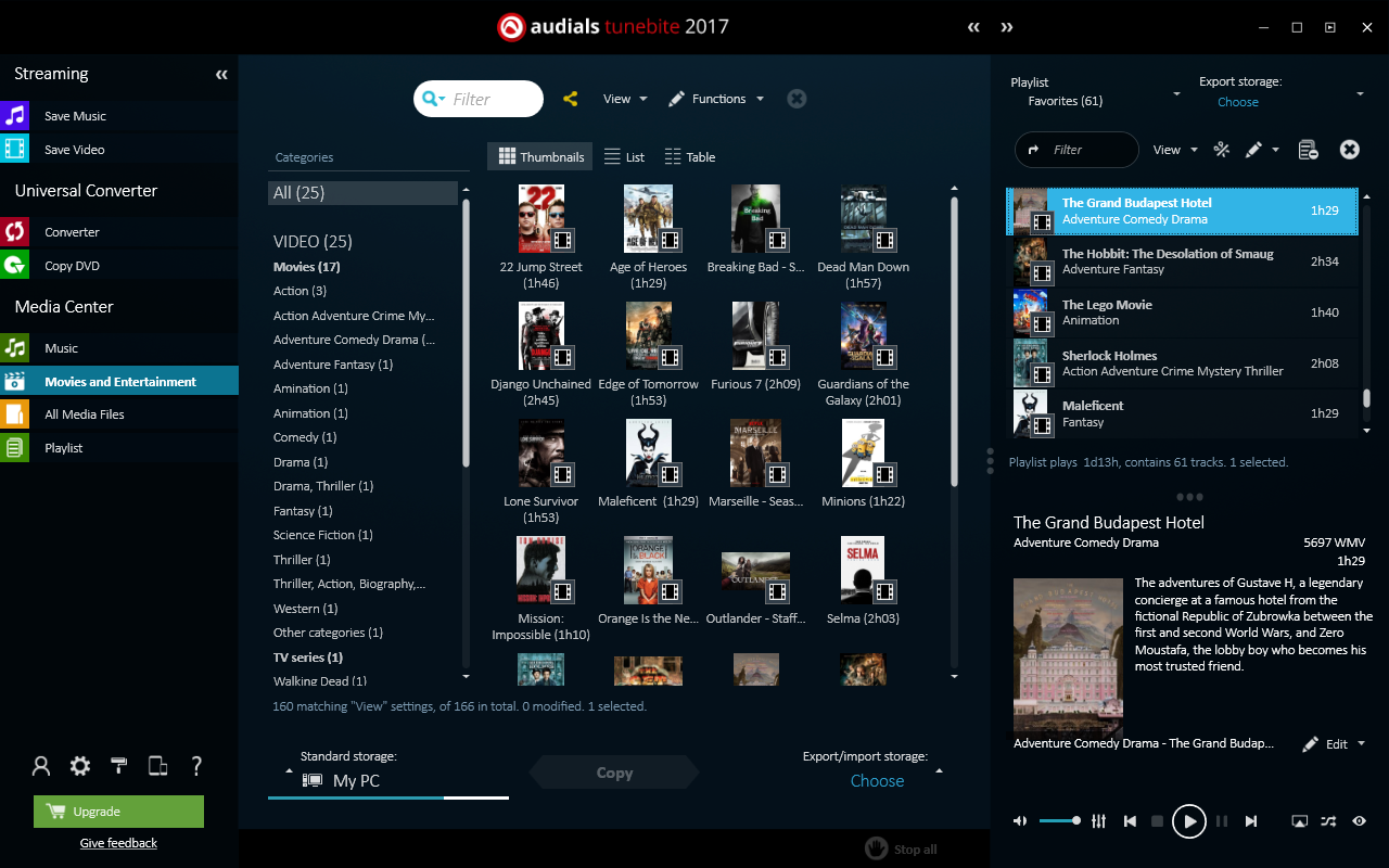 Audials Tunebite Platinum also records protected streams for movies and TV series from online media libraries and all video streams in the highest quality. Recordings are saved in any desired format for PC, smartphone or tablet with all movie tags.