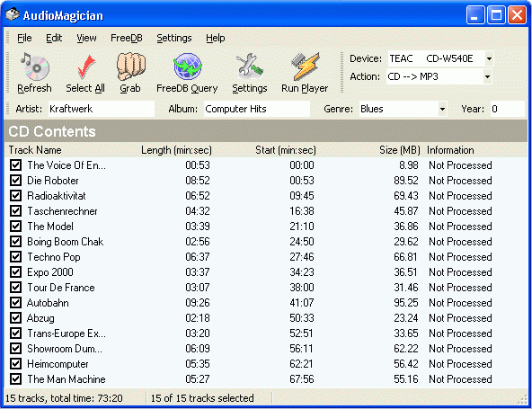AudioMagician CD Ripper is a simple, user-friendly audio ripper and encoder. Its main function is to rip audio CD tracks to Mp3 or Wav files. It includes many useful features that make the process fast and easy. It offers easy access to the FreeDB internet database (an information database containing artist name, album and song title and other data). ID3 tags v.1 and v.2 are supported. Try this 30-day trial version!
