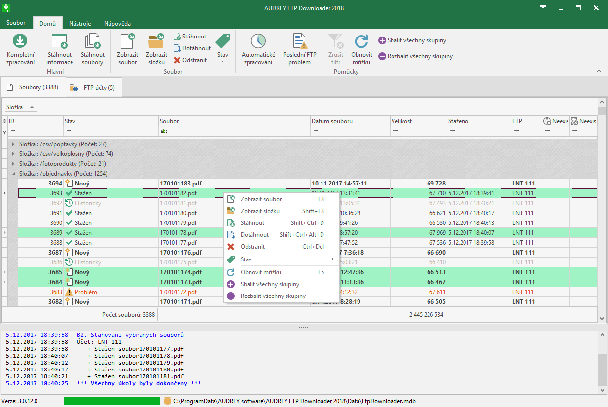 The new version of FTP Downloader 2018 builds on the principles that have proven successful in the previous 2012 and 2015 versions. In this case, however, it has been changed from the ground up technologically, many features have been modified and the application has also gained a newer look and additional settings options. The main new feature is undoubtedly background downloading, so that it is possible to work with files even when automating, support for downloading files that are larger than 4 GB has been added, support for High DPI monitors, but also better automation, which now includes file deletion and database reduction. Not to be left aside is the improved customizability of the user interface, the possibility of notifications when files are downloaded or a problem occurs, and localization into English.