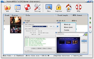 Aurora MPEG To DVD Burner is a versatile program that allows you to burn AVI, MPEG files to DVD-R, DVD+R, DVD+RW, DVD-RW discs. You can then play your favorite movies on your DVD player. It can create nice and clear DVD menus, offers various styles, backgrounds, text effects. In cooperation with Aurora Media Workshop, you can convert, join and split video files to mpeg format and burn them to a rewritable DVD disc.