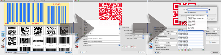 With Barcode Generator you will be able to create QR codes and barcodes in just three easy steps - just select a template, edit the content/color/properties and then export! In minutes you have fully functional codes!