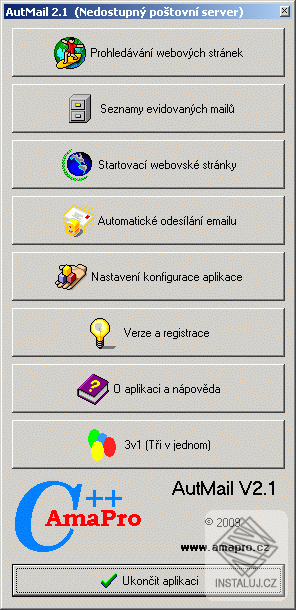 The AutMail application is a mail client designed for mass sending of informational and promotional emails. The design of the application is based on the conventions of the Czech Internet, but it is still a very powerful tool. The frequency and method of sending is set just below the junk mail (SPAM) threshold. The sender can be anonymous or correct, i.e. usable even for a return reply. The application contains correct lists of email addresses of various Czech companies, which are sorted according to the field of activity. The user just inserts the text of the message and selects the target group to be addressed and starts the mechanism of sending emails e.g. with an interval of 2 seconds.