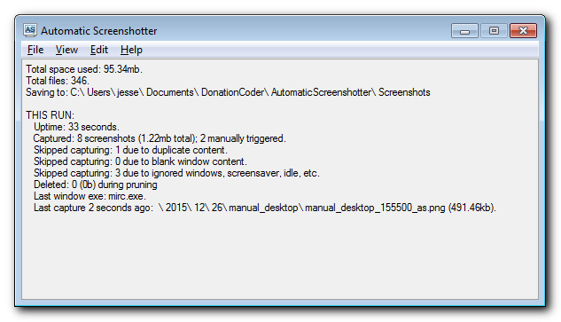 Automatic Screenshotter is a tool that is ready in the system tray to take regular screenshots of your desktop or active window. You can set how often screenshots are taken and how they are named. By naming them, they will be included in subdirectories. You can easily switch the program in the system tray or by using the set keyboard shortcuts. Screenshots are saved as standard PNGs.