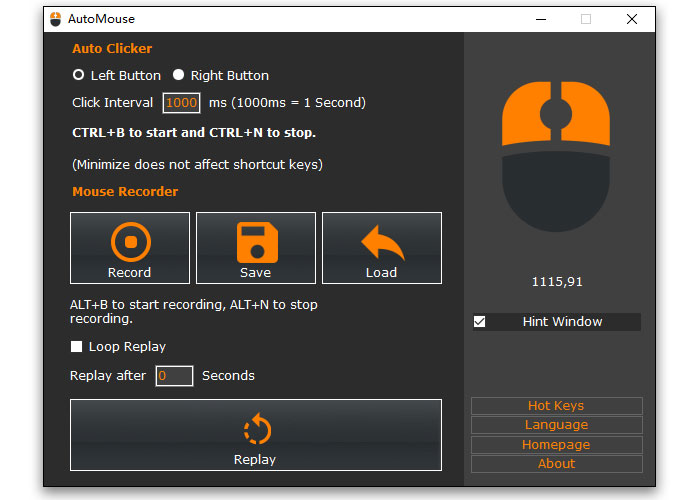 In addition to simulating left and right mouse clicks at a fixed position on the screen at the millisecond level, AutoMouse can also perform a lot of repetitive work with the loop function while recording the mouse and cursor. This allows users to record mouse clicks and cursor tracks, and then have the mouse repeat those actions in a loop until they are terminated by hotkeys. The loop simply replays the automation every x number of seconds.