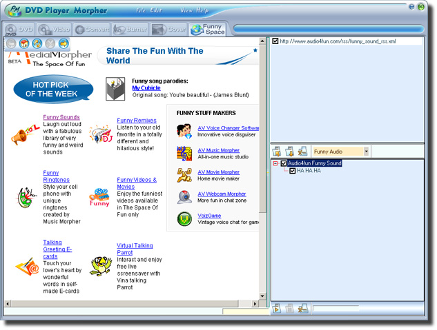 AV DVD Player Morpher - contains many functions such as: playback, morphing, converting, burning, audio/video recording, etc. It contains a large number of audio and video effects.
