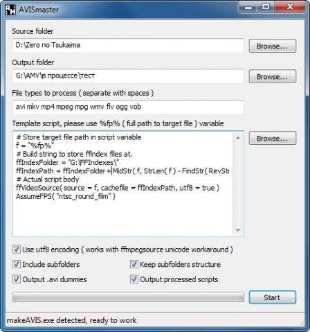 AVISmaster is a small and handy batch file processing application and specially designed for AviSynth scripts. In this application, makeAVIS (part of ffdshow) can also be used to generate scripts using a template and create fake AVI files with an embedded AviSynth script wrapper for the target media files.