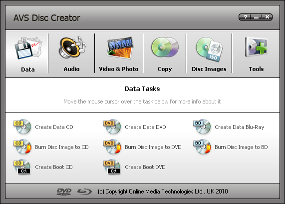 Simple and intuitive interface, many useful functions, features and support for many file types - all this is offered by AVS Disc Creator! It is designed for creating home video DVD copies, DVD discs for DVD and Blu-Ray players and other burning tasks.