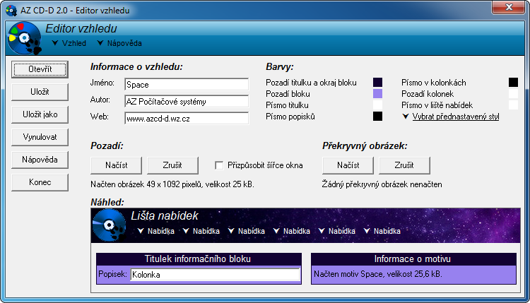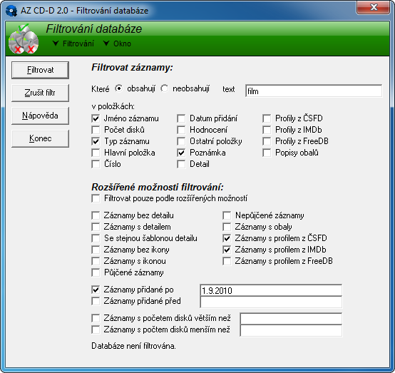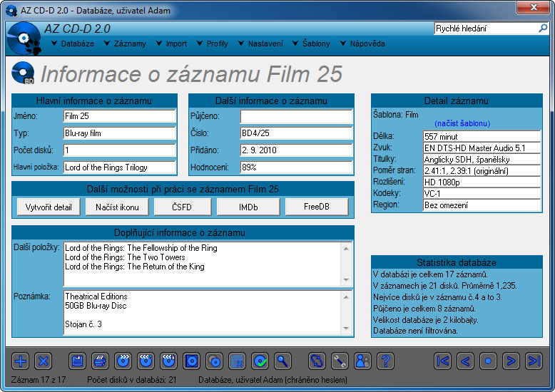AZ CD-D is an application designed to create and manage a database of any optical media. The database consists of two parts. The first part is fixed and the same for all records, containing general entries such as record name, number, date added, etc., while the second part is optional and allows the user to add his own entries to the database. These items are created as a template by the user and can then be applied to any number of records. This allows you to customize the database to your own needs and record different types of discs (e.g. music, film, data, ...) and specify which information you want to have in the database.