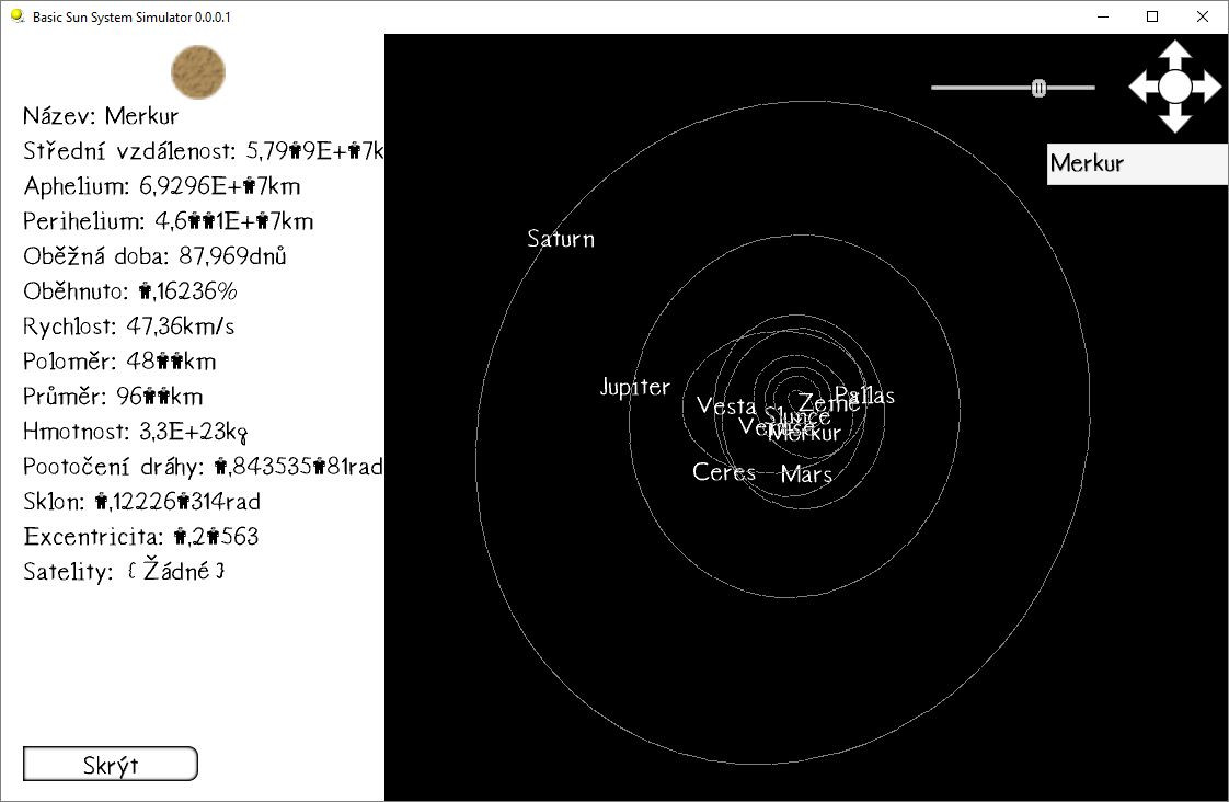The program displays in 2D the movements of planets and other objects with their details. If they are not displayed move the slider - the zoom will change. The program uses data freely available on Wikipedia.