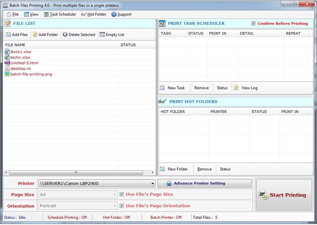 Batch Files Printing is a unique tool for batch printing of files (DOC, DOCX XLS, XLSX, PPT, PDF, RTF and images such as JPG, GIF, TIF, etc.) This tool prints all files in a batch process. It is possible to set the printing to a later time.