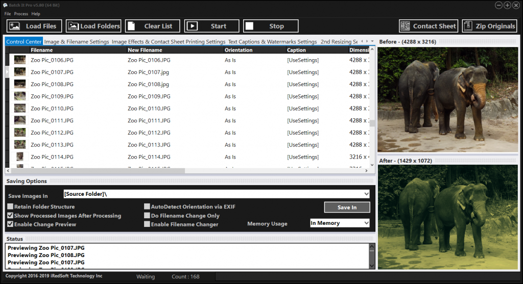 Batch It Pro is an image processor that supports bulk image manipulation features such as resizing images, inserting captions, watermarks and the ability to save in various file formats. It even allows you to resize images in two sizes at once.