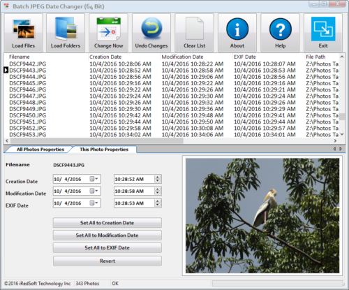 Batch JPEG Date Changer is an application for bulk modification of creation date, modification date and EXIF date of photos and images. All of this information represents attributes that are stored directly in the file and are publicly accessible. The application allows you to bulk load a list of images or photos and apply changes with one click.